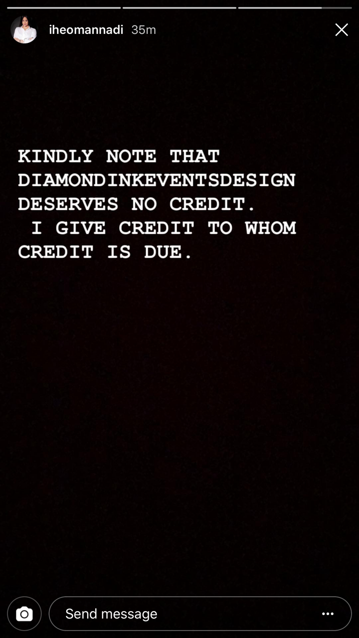 “Kindly note that Diamondinkeventsdesign deserves no credit. I give credit to whom credit is due”.