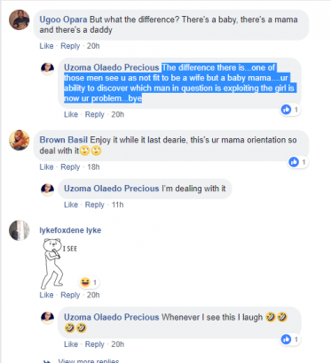 Uzoma then replied saying, “The difference there is…one of those men see u as not fit to be a wife but a baby mama…ur ability to discover which man in question is exploiting the girl is now ur problem…bye.”