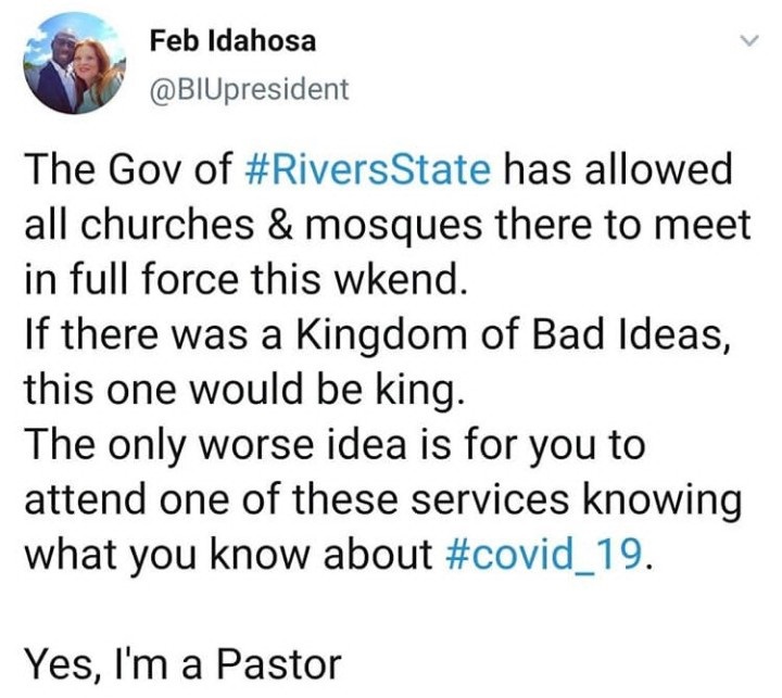 “The Gov of #RiversState has allowed all churches & mosques there to meet in full force this wkend. If there was a Kingdom of Bad Ideas, this one would be king. The only worse idea is for you to attend one of these services knowing what you know about #covid_19. Yes, I’m a Pastor.