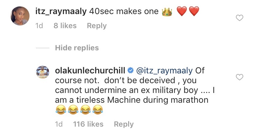 Tonto Dikeh’s estranged husband, Olakunle Oladunni Churchill has replied a follower who hinted he is a “40 seconds” man as his ex-wife alleged.