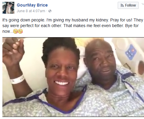 After he was diagnosed with Kidney failure for four years, GourMay Brice has announced on Facebook that she’d be donating her kidney to her husband of 25 years, George Brice.