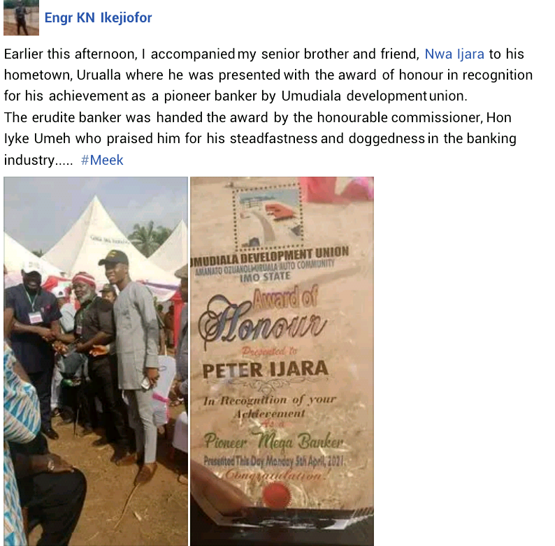 A Nigerian man, Peter Ijara has been honored for his achievement as the first banker in the history of Amanato Ozuakoli Uruala community in Imo State.