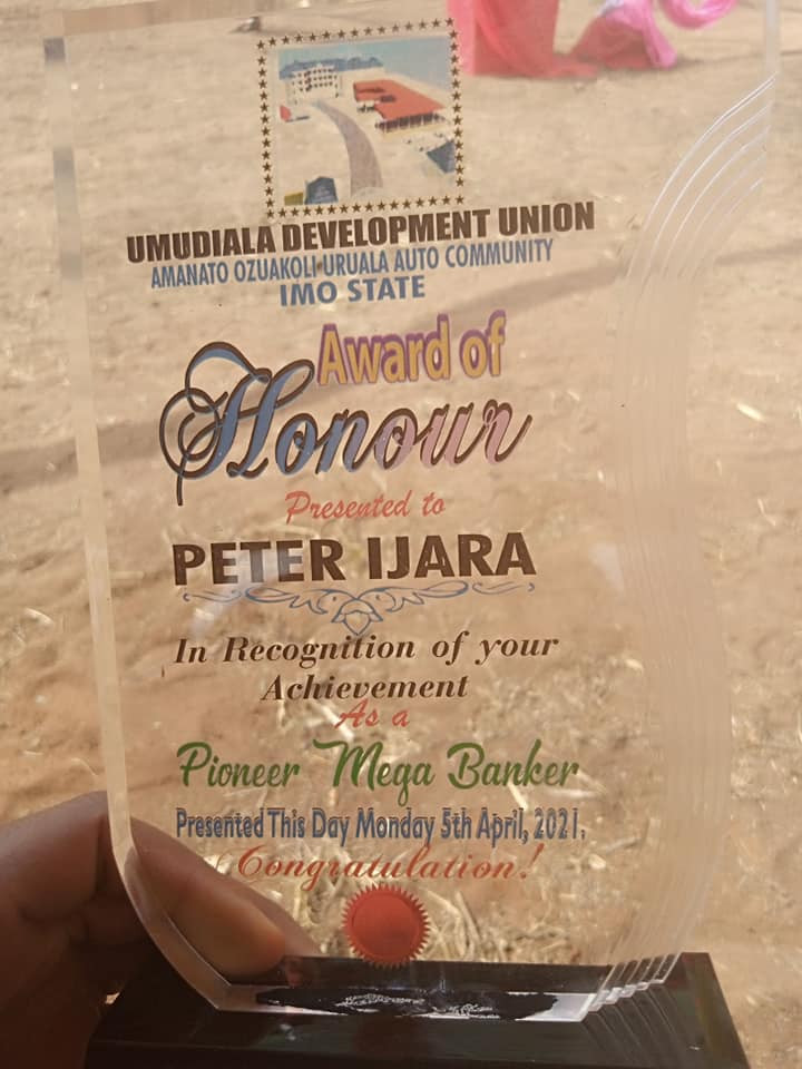 Ijara was conferred with an award of honour for being the community’s “Pioneer Mega Banker” at a ceremony organised by Umudiala Development Union on Monday, April 5.