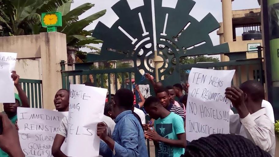 According to an eyewitness, the protest which kick started around 09:00am on Wednesday morning, was based on closure of the school’s hostels just 10 weeks after resumption, increment in transcript fee, suspension of the students union government and more.