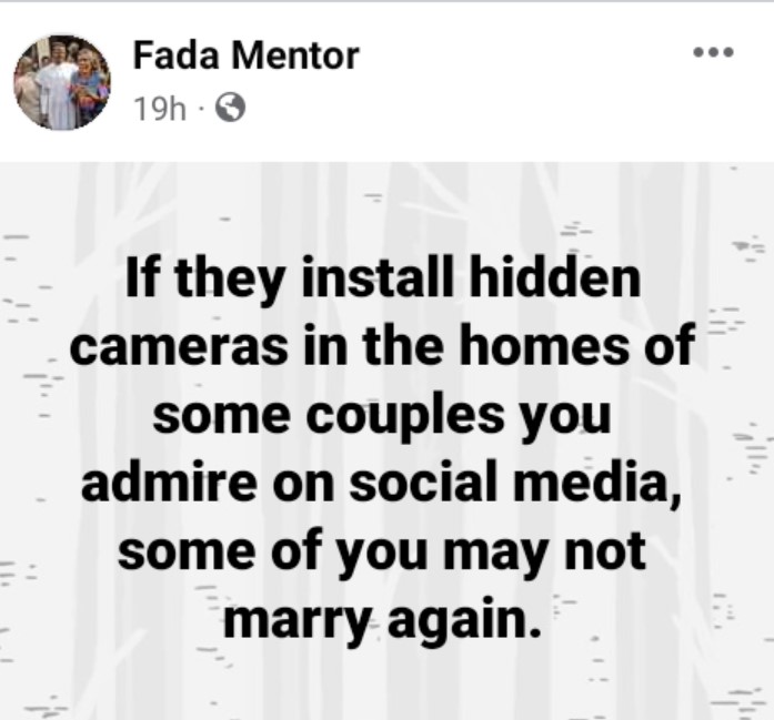 “If they install hidden cameras in the homes of some couples you admire on social media, some of you may not marry again.
