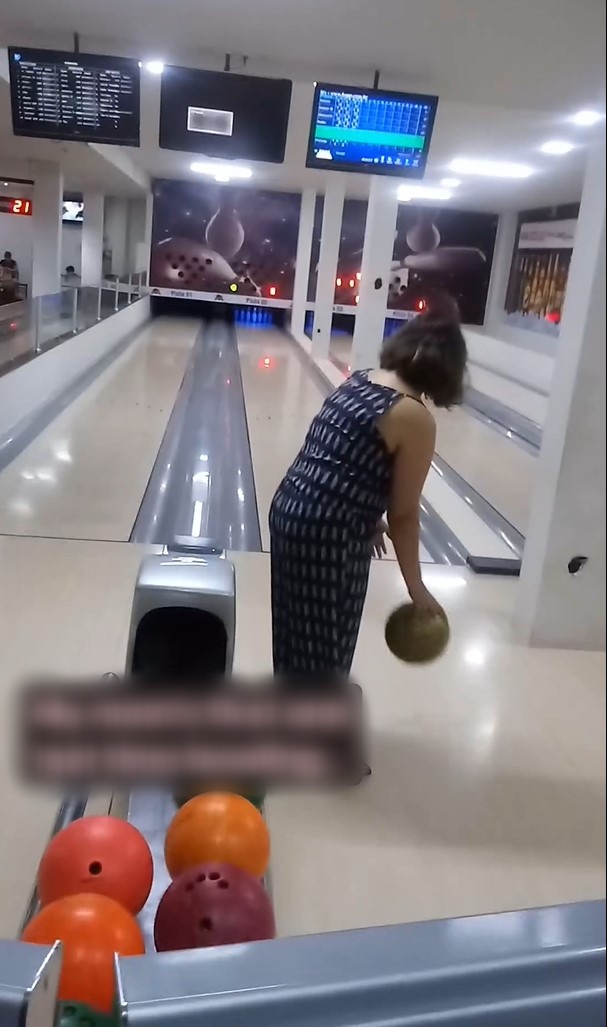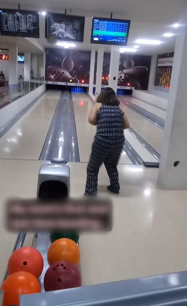 The woman who was new to the game, was captured in the video swinging the bowling ball in her hand back and forth.