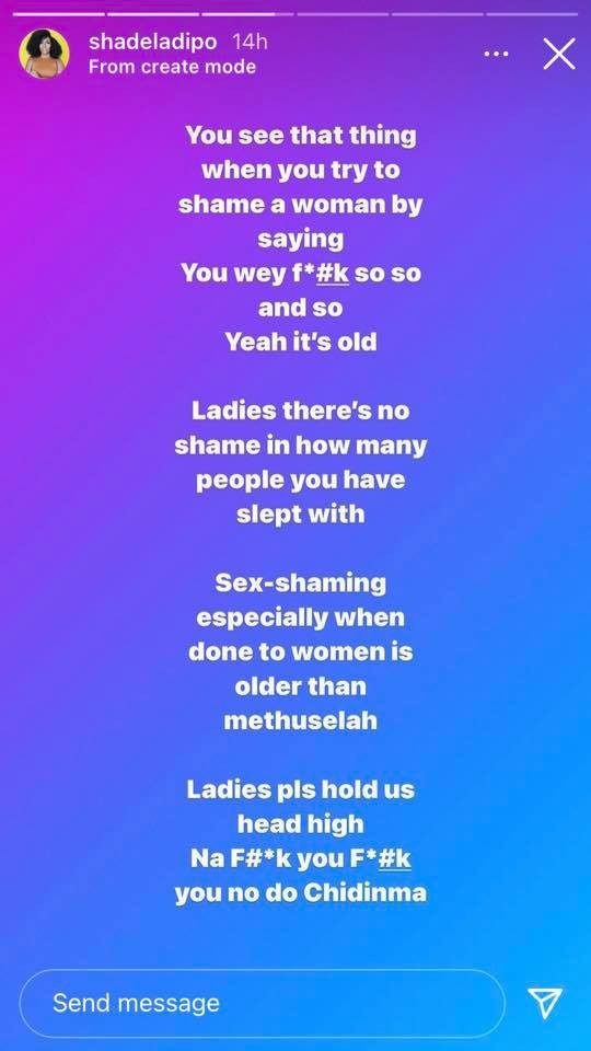 In a post she shared on her Instastory, Shade had stated that the act of shaming women because of the men they’ve slept with is already old and lame.