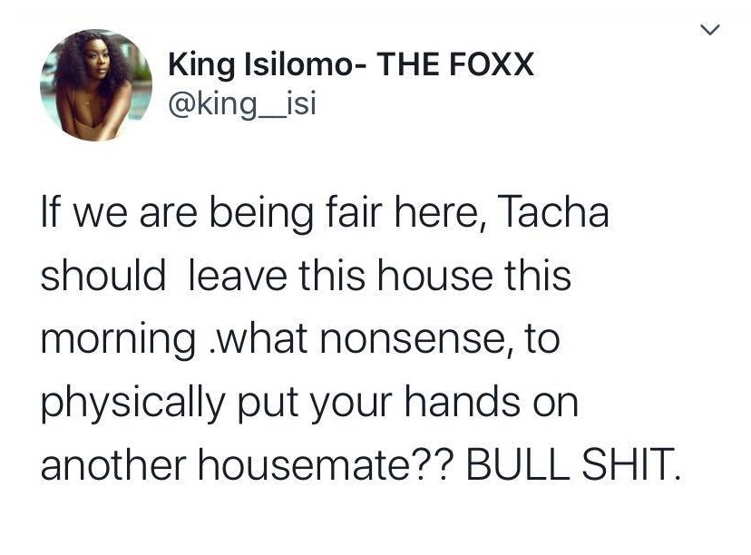 “If we are being fair here, Tacha should leave this house this morning .what nonsense, to physically put your hands on another housemate?? BULL SH*T.”