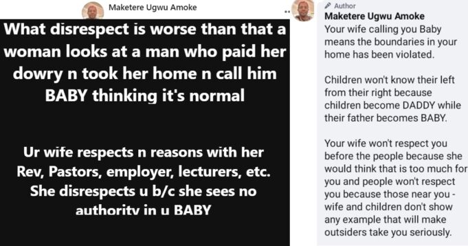A marriage coach on Facebook, Maketere Ugwu Amoke has ignited controversy by asserting that when a woman calls her husband ‘baby’, it is a sign of disrespect rather than affection.