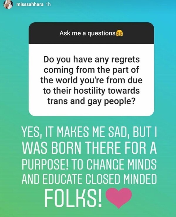 Do you have any regrets coming from the part of the world you’re from due to their hostility towards trans and gay people ?