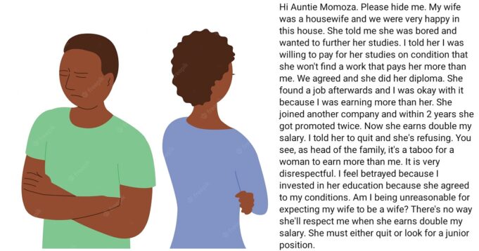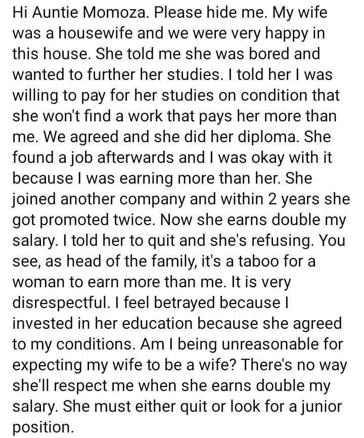 “Hi Auntie Momoza. Please hide me. My wife was a housewife and we were very happy in this house. She told me she was bored and wanted to further her studies. I told her I was willing to pay for her studies on condition that she won’t find a work that pays her more than me. We agreed and she did her diploma. She found a job afterwards and I was okay with it because I was earning more than her. She joined another company and within 2 years she got promoted twice. Now she earns double my salary. I told her to quit and she’s refusing. You see, as head of the family, it’s a taboo for a woman to earn more than me. It is very disrespectful. I feel betrayed because I invested in her education because she agreed to my conditions. Am I being unreasonable for expecting my wife to be a wife? There’s no way she’ll respect me when she earns double my salary. She must either quit or look for a junior position.”