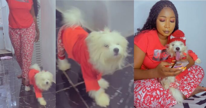 In a video made by the younger sister, @princessphyna0 who shared what she saw on getting to her sister’s place, the dog was seen donning a pretty red and white top and pants.