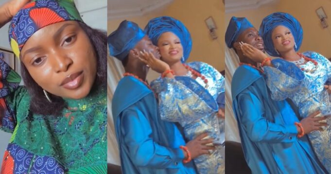 The clip, captured during their wedding photo shoot, shows the couple posing sweetly as the groom places his hand around his bride’s waist while she gently pats his cheek.