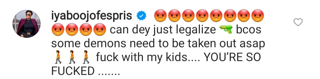The mum of two wrote: “Can dey just legalise guns bcos some demons need to be taken out asap. f**k with my kidsā¦. YOUāRE SO F**KED.”