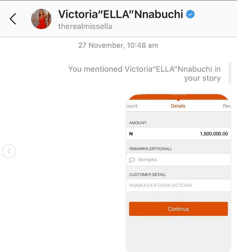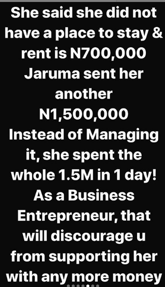 Jaruma, who aided Ella out with N600,000 when she made a cry out over her mother’s health, revealed she gave Ella another N1.5 million after she cried out to her on needing the sum of 700 thousand naira for her house rent.