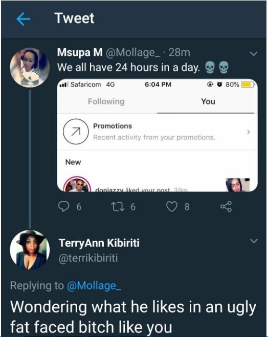 For some reason, a jealous Twitter user could not contain her anger and lashed out at her calling her an ‘ugly faced bitch’.