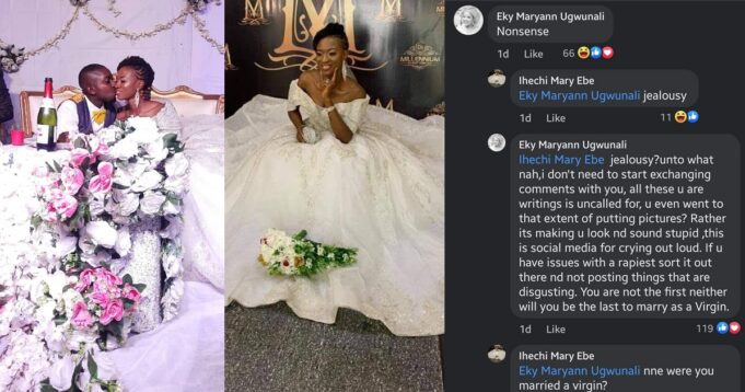 A particular follower told her sharing the photo is “nonsense” and followed up with a lengthy comment on why she couldn’t be jealous of the virgin bride after the latter said she was.