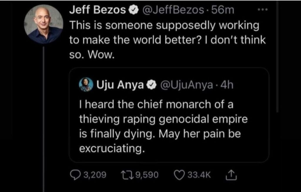 Former richest man in the world, Jeff Bezos has slammed a Nigerian professor, Uju Anya, for wishing Queen Elizabeth II an “excruciating” death.