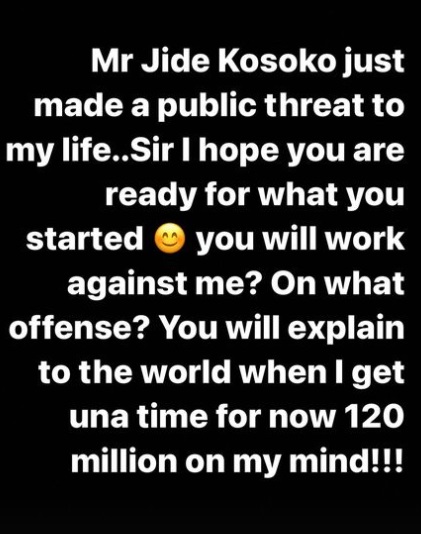 Mr Jide Kosoko just made a public threat to my life..Sir I hope you are ready for what you started T you will work against me? On what offense? You will explain to the world when I get una time for now 120 million on my mind!!!