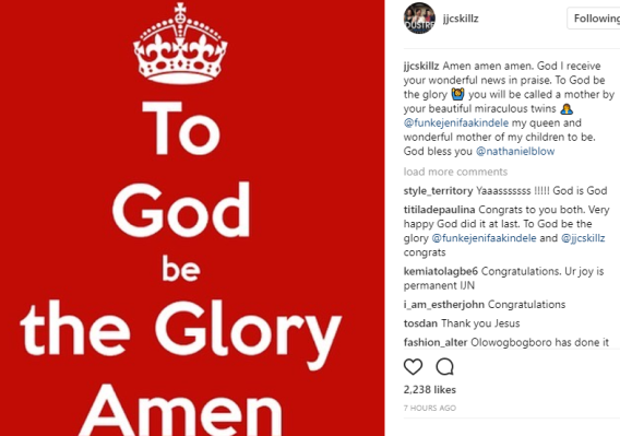 A new IG post by her Husband, JJC, earlier today, insinuated that they’re expecting a set of twins… and then again, Funke Akindele, during the Hallelujah challenge last night, specifically thanked God for safe delivery as well as for conception.