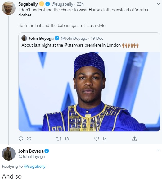 John Boyega attended the Star Wars Premiere in London dressed in traditional attire to show off his Nigerian roots but Sugabelly criticized his outfit and he dismissed her with a few words.