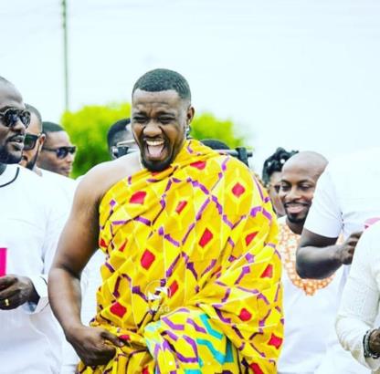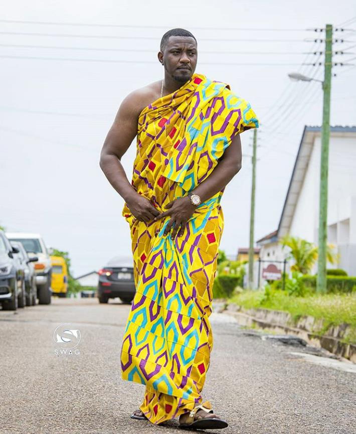 The dark, lovely and handsome actor can be seen rocking a Kente cloth with Military men guarding him.