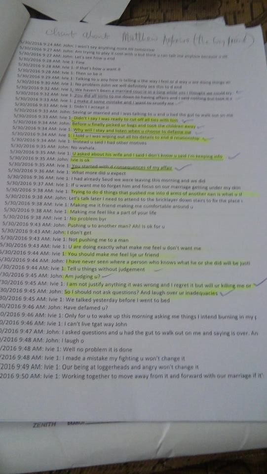 Until May 2016, when my kids where on midterm break, and they came to spend the holiday with me in Yaba that two of my children told me that, every night, one uncle Matthew was always coming to the house to sleep in mummy’s room till the next day and he will buy them suya. And when I asked Ivie she initially denied until I showed her a video clip of what the children told me that she then admitted (see attached our chat for your perusal) and at this time Ivie was still pregnant.