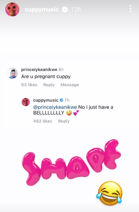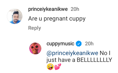 Reacting to the pregnancy speculations in the comment section of the post, DJ Cuppy stated that she only has a belly and and is not pregnant.
