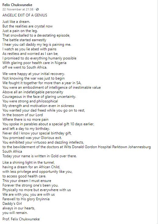 Felix who is a Professor and Consultant Surgeon at the University of Nigeria Teaching Hospital, Nsukka, in his tribute stated that Chisom died a day to his birthday and 10 days after she had promised him a special gift.