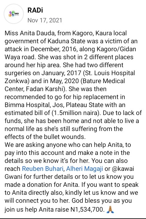 “Miss Anita Dauda, from Kagoro, Kaura local government of Kaduna State was a victim of an attack in December, 2016, along Kagoro/Gidan Waya road. She was shot in 2 different places around her hip area. She had two different surgeries in January, 2017 (St. Louis Hospital Zonkwa) and in May, 2020 (Bature Medical Center, Fadan Karshi)