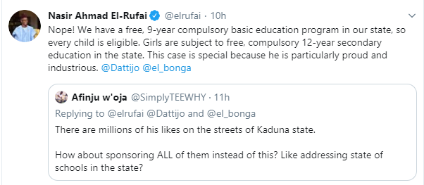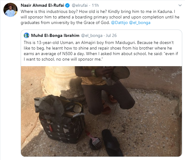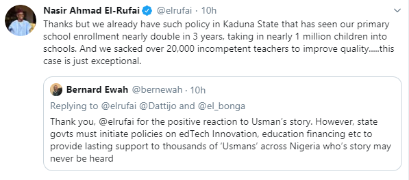 Reacting to the tweet, Governor El-Rufai described the young boy as ‘hardworking’, and further promised to sponsor his education.