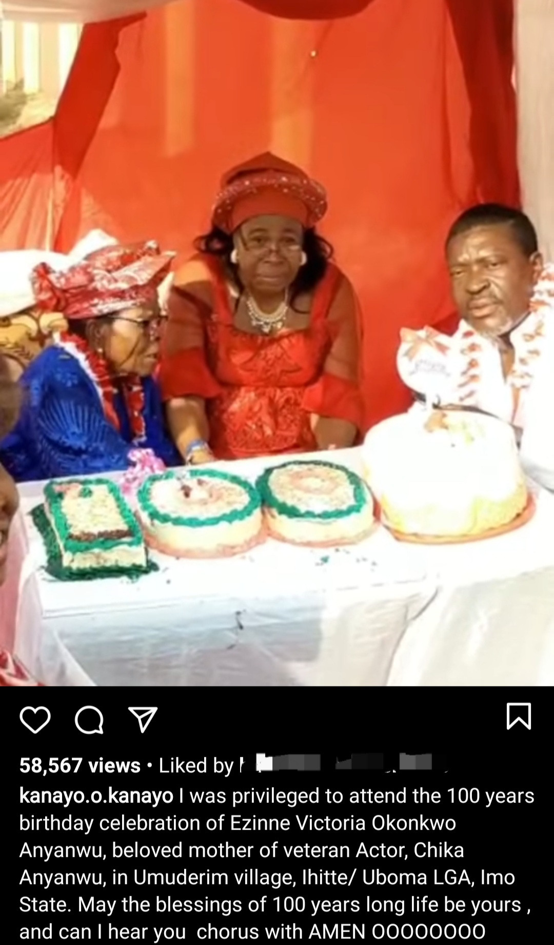 The actor took to social media to share a video of himself paying homage to Ezinne Victoria Okonkwo Anyanwu, the mother of veteran actor, Chika Anyanwu, as she turns 100.