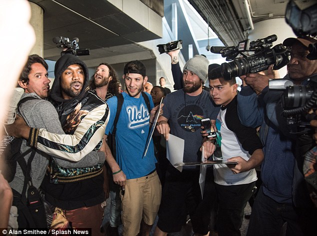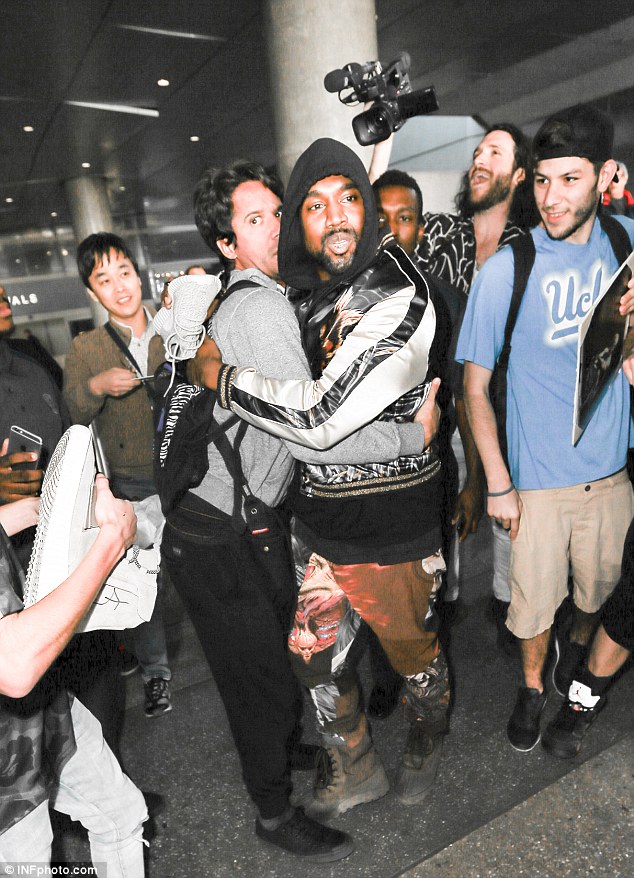Kanye was mobbed by fans when he touched down at the busy terminal. He was all smiles until he noticed two photographers pushing each other.