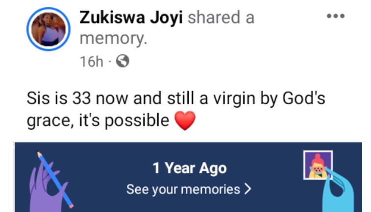 Zukiswa Joyi, 33, revealed in a Facebook post that her friend, Sunshine, is also a virgin.