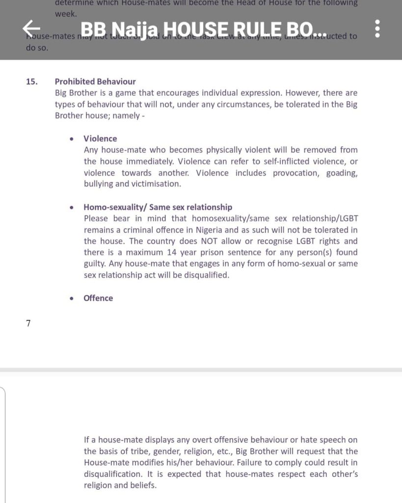 The rule book stated that violence which includes goading, provocation, bullying and victimization will not be tolerated in the house as the reality show encourages individual expression.