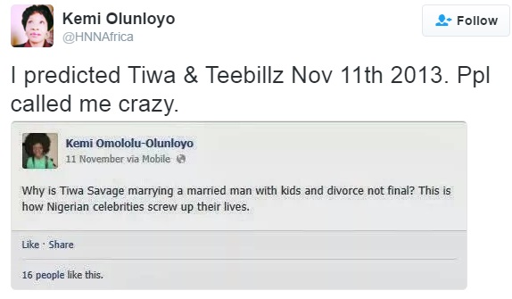 “I predicted this breakdown almost three years ago in a Facebook post. “Why is Tiwa Savage marrying a man with kids and divorce is not final yet? This is how Nigerian celebrities screw up their lives.” I was crucified on social media for this statement and bloggers jumped on it all criticizing me as “jealous”. That was November 11th 2013. Previously to that post I had interviewed Savage at a concert asking her about marriage, family and kids and she said she definitely wanted that aspect in her life one day only to discover she chose to date her married manager. This is now. Tiwa revealed in the interview that her husband was indeed suicidal, contrary to his deleted suicidal note posted on instagram, something fans were earlier misled about, he had a drug habit with cocaine, owed N45M as a bad debt partly in her name, jealous of her success, defamed and slandered her claiming she slept with label mates Don Jazzy and Dr Sid along with singer TuFace Idibia, abandoned her in Jamaica while she suffered a miscarriage and he was with another woman saved on his phone as “Edible Caterer” and finally infidelities that included another and a secret 3rd child in Nigeria she had no knowledge of. That was a massive handful as Savage revealed in her interview shedding tears saying their marriage was over.