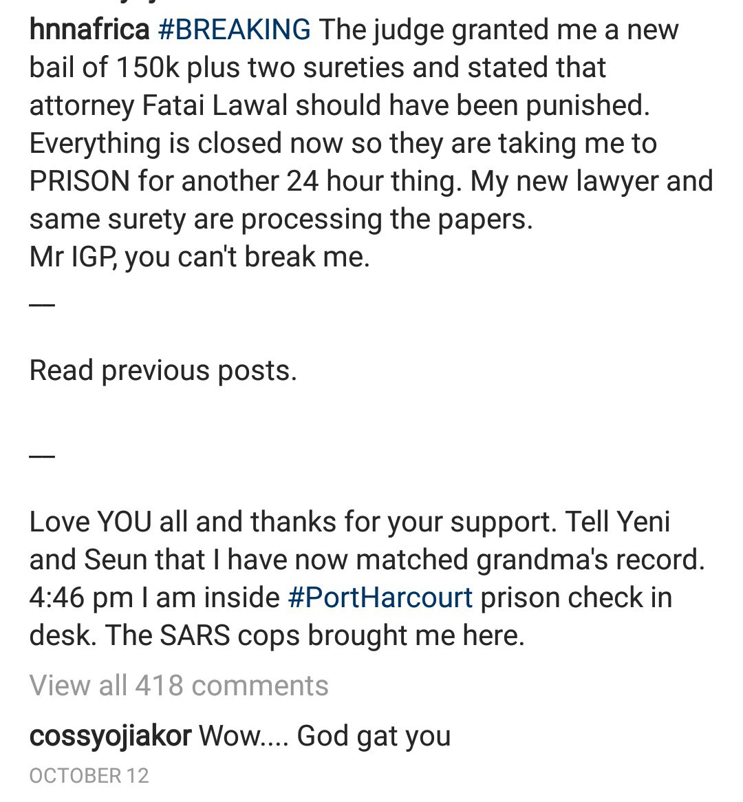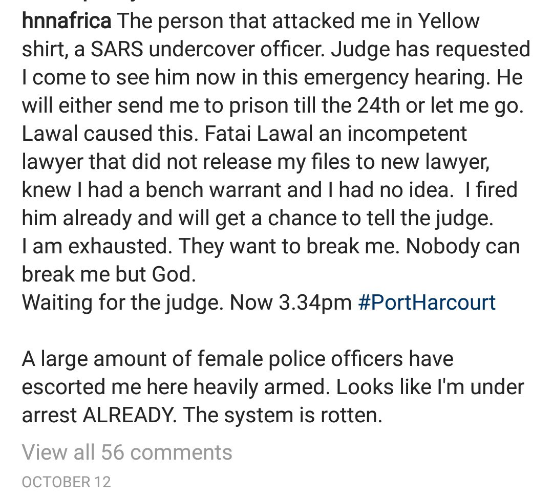 All seemed to go well, as she went on about her social media critique business until October 12 when she had exclaimed to her internet fans and Nigerians in general, that she had to go to court again and from the look of things she would have to stay another night at the court prison.
