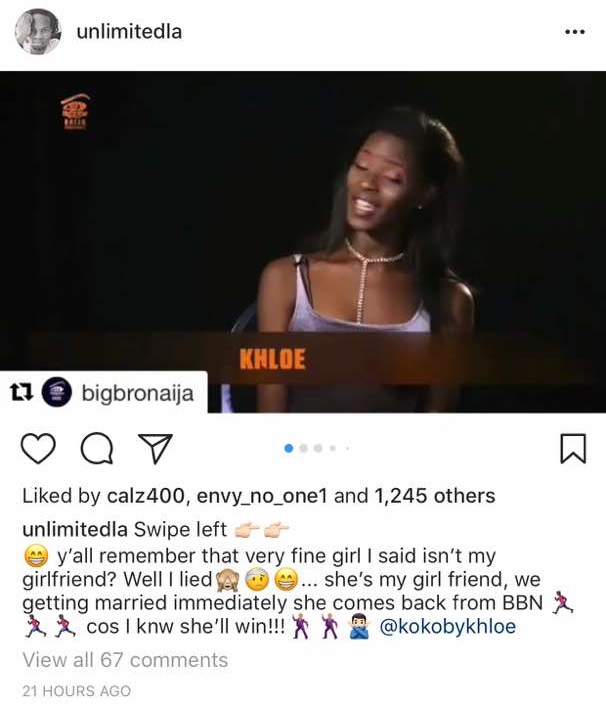 He wrote: “Y’all remember that very fine girl I said isn’t my girlfriend? Well I lied, she’s my girl friend, we getting married immediately she comes back from BBN, cos I knw she’ll win! @kokobykhloe”.