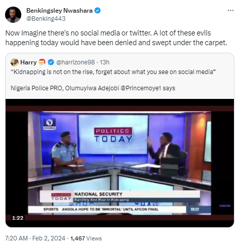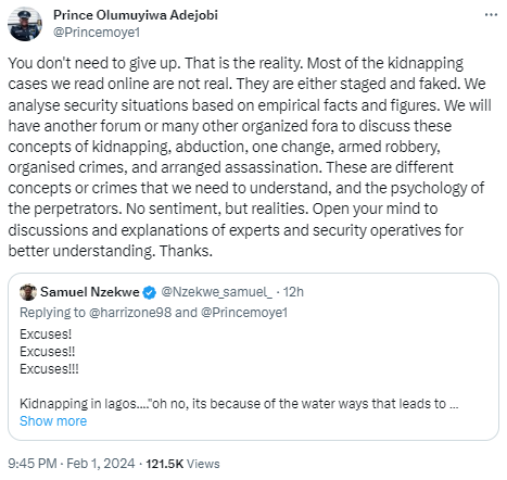 Following the interview, the PRO took to the Twitter to reiterate his statement, adding that most of the kidnapping cases reported online were either staged or faked.