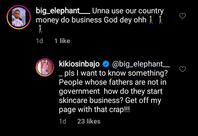 “Pls I want to know something? People whose fathers are not in government how do they start skincare business? Get off my page with that crap!!!”