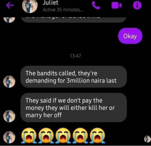 From the chat, it is deduced that the bandits have made contact with the lady’s family and are demanding for a ransom of N3 million. They added that they will kill the lady or marry her off if her family fails to meet their demand.