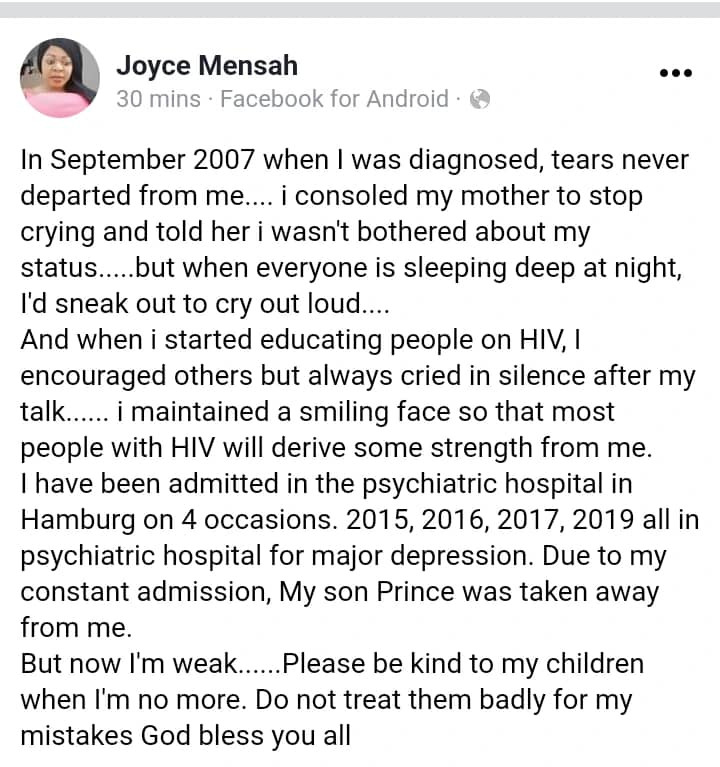“And when I started educating people on HIV, I encouraged others but always cried in silence after my talk….I maintained s smiling face so that most people with HIV will derive some strength from me. I have been admitted to the psychiatric hospital in Hamburg on 4 occasions. 2015, 2016, 2017, 2019 all in a psychiatric hospital for major depression. Due to my constant admission, my son Prince was taken away from me.