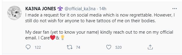 In a recent tweet Ka3na recalled she asked for the tattoos online, an act she now considers as regrettable, and emphasized that she still doesn’t wish for anyone to tattoo her name or photos on their bodies.