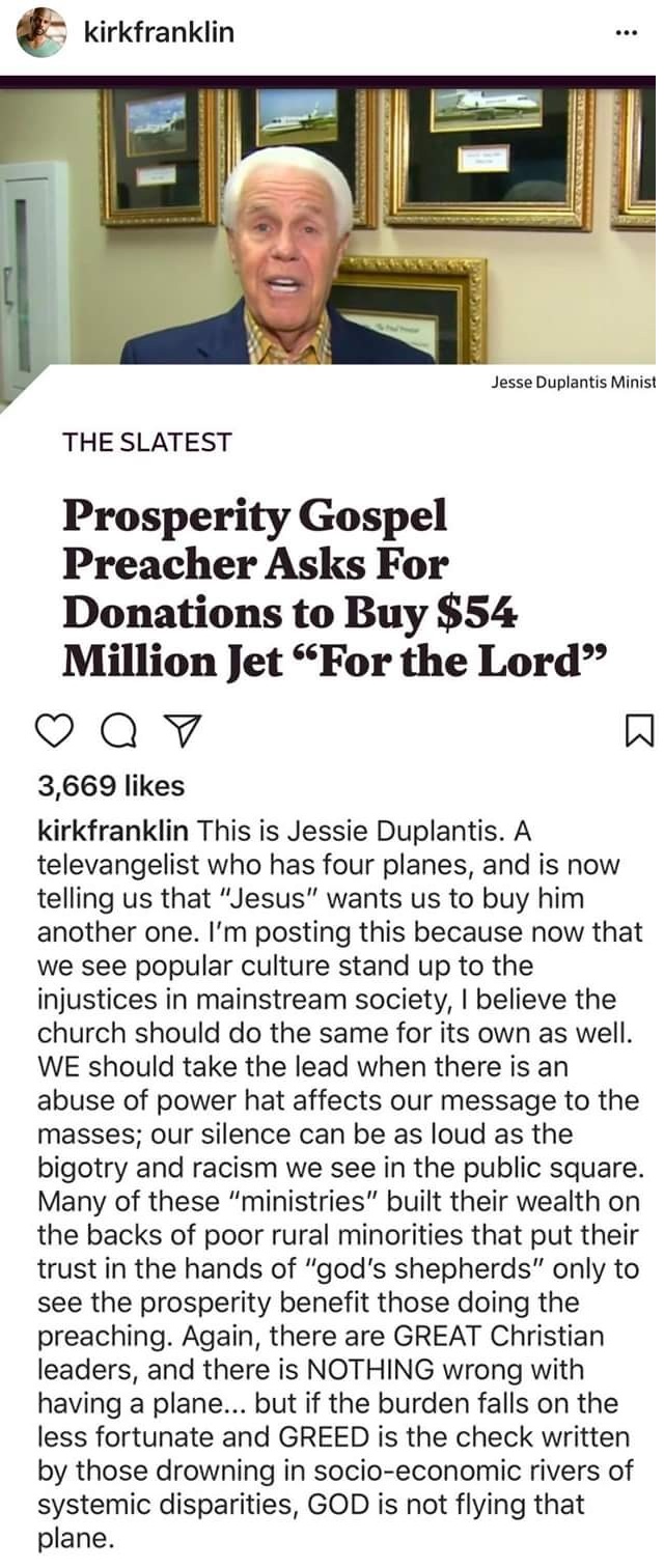 Gospel singer Kirk Franklin took to Instagram to criticize televangelist, Jesse Duplantis, who has asked his disciples to pray so that he can buy a $54million private jet as instructed by God.