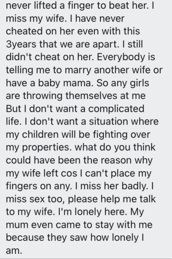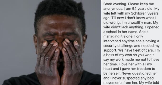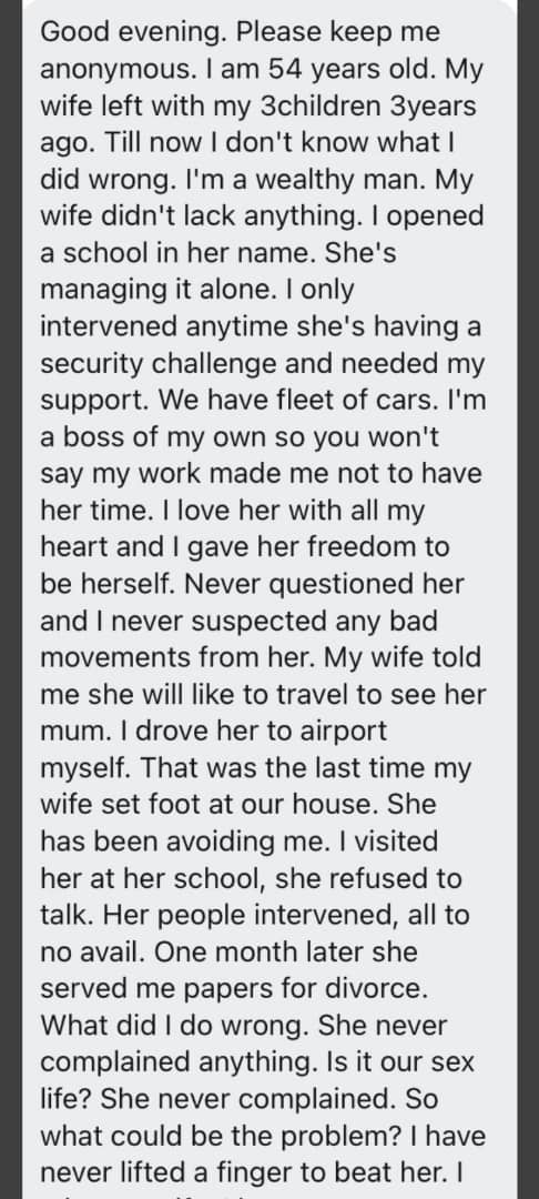 “Good evening. Please keep me anonymous. I am 54 years old. My wife left with my 3 children 3 years ago. Till now I don’t know what I did wrong.