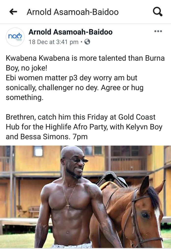 “Kwabena Kwabena is more talented than Burna Boy, no joke! Ebi women matter p3 dey worry am but sonically, challenger no dey. Agree or hug something…”
