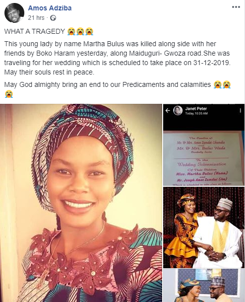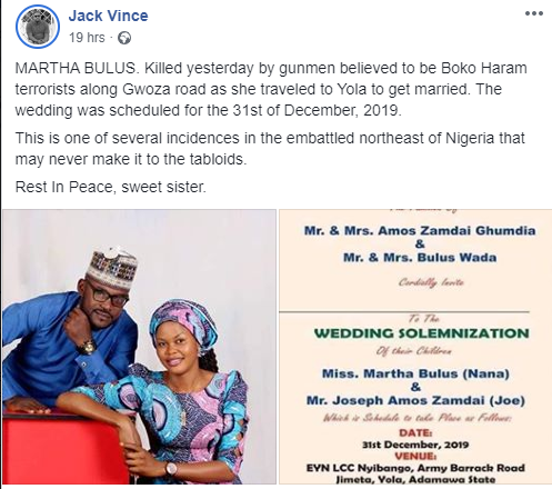 MARTHA BULUS. Killed yesterday by gunmen believed to be Boko Haram terrorists along Gwoza road as she traveled to Yola to get married. The wedding was scheduled for the 31st of December, 2019.