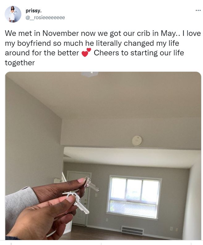 ”We met in November now we got our crib in May.. I love my boyfriend so much he literally changed my life around for the better 💕 Cheers to starting our life together.”