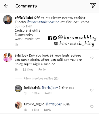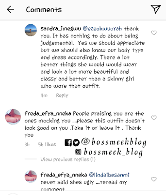 “Dnt you look at you body before you wear cloths after you will say you are doing night vigil for who na”. So she replied with her next post on Instagram.