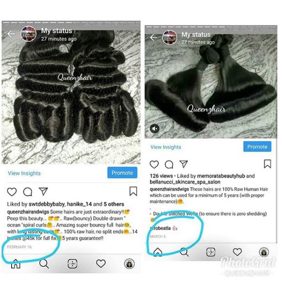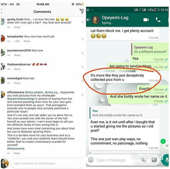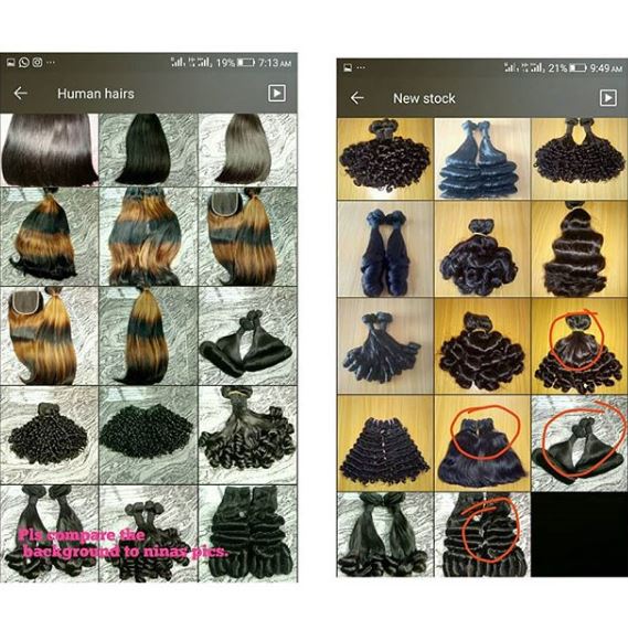According to the lady, said that Nina contacted her to buy her hair wig in wholesale, and she hurriedly send her pictures of her collection without watermarks only for Nina to upload her pictures on her Instagram.